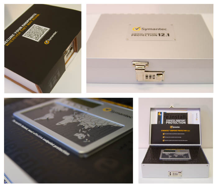 Symantec is the largest maker of security software for personal computers. They help consumers manage and protect their information-driven world. Symantec came to us wanting a high-end direct mail piece to launch their new product, Symantec Endpoint Protection 12.1. I concepted with a writer and designed this custom-made lock box with a world clock inside.